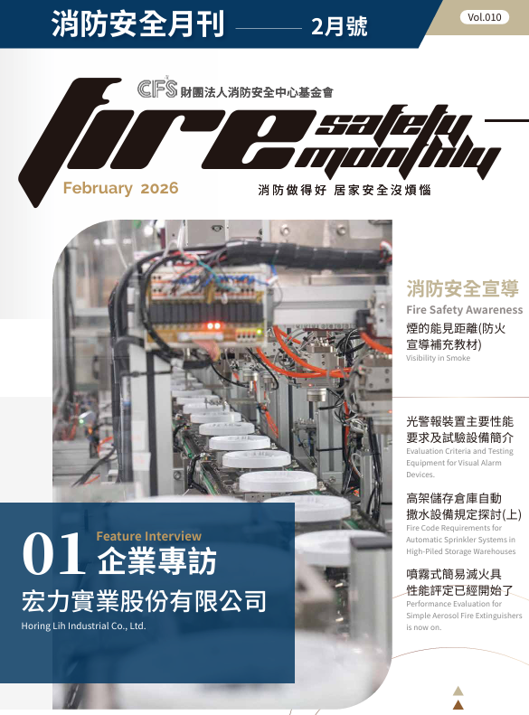 【消防月刊】第十期 - CFS消防安全月刊月刊內容 : 1. 企業專訪:宏力實業股份有限公司專訪 2. 評定基準及設備解說:光警報裝置主要性能要求及試驗設備簡介 3. 火災預防專題 : 高架儲存倉庫自動撒水設備規定探討(上) 4. 基金會活動 : 噴霧式簡易滅火具性能評定已經開始了 5. 消防安全宣導 : 09-煙的能見距離(防火宣導補充教材) 6. 近期業界動態、基金會快訊 | 線上觀看(電子書ebook) | | 下載PDF檔案 | 2026/03/23 >> 更多消防月刊 |