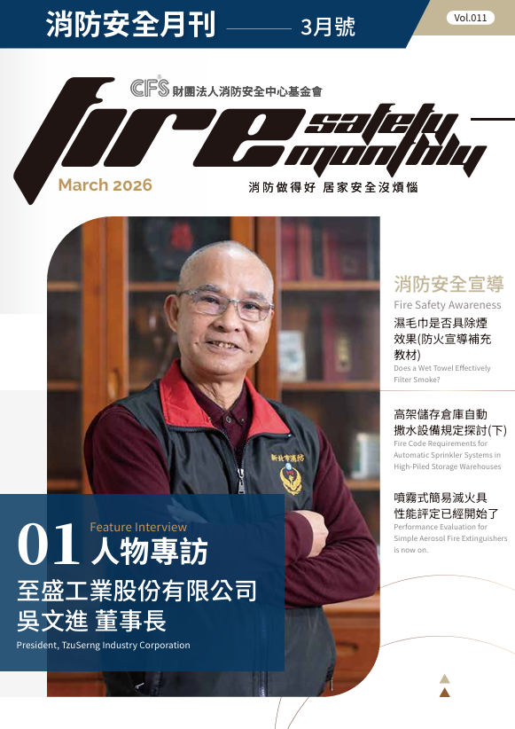 【消防安全月刊】第十期 - CFS消防安全月刊月刊內容 : 1. 企業專訪:宏力實業股份有限公司專訪 2. 評定基準及設備解說:光警報裝置主要性能要求及試驗設備簡介 3. 火災預防專題 : 高架儲存倉庫自動撒水設備規定探討(上) 4. 基金會活動 : 噴霧式簡易滅火具性能評定已經開始了 5. 消防安全宣導 : 09-煙的能見距離(防火宣導補充教材) 6. 近期業界動態、基金會快訊 | 線上觀看(電子書ebook) | | 下載PDF檔案 | 2026/03/23 >> 更多消防安全月刊 |