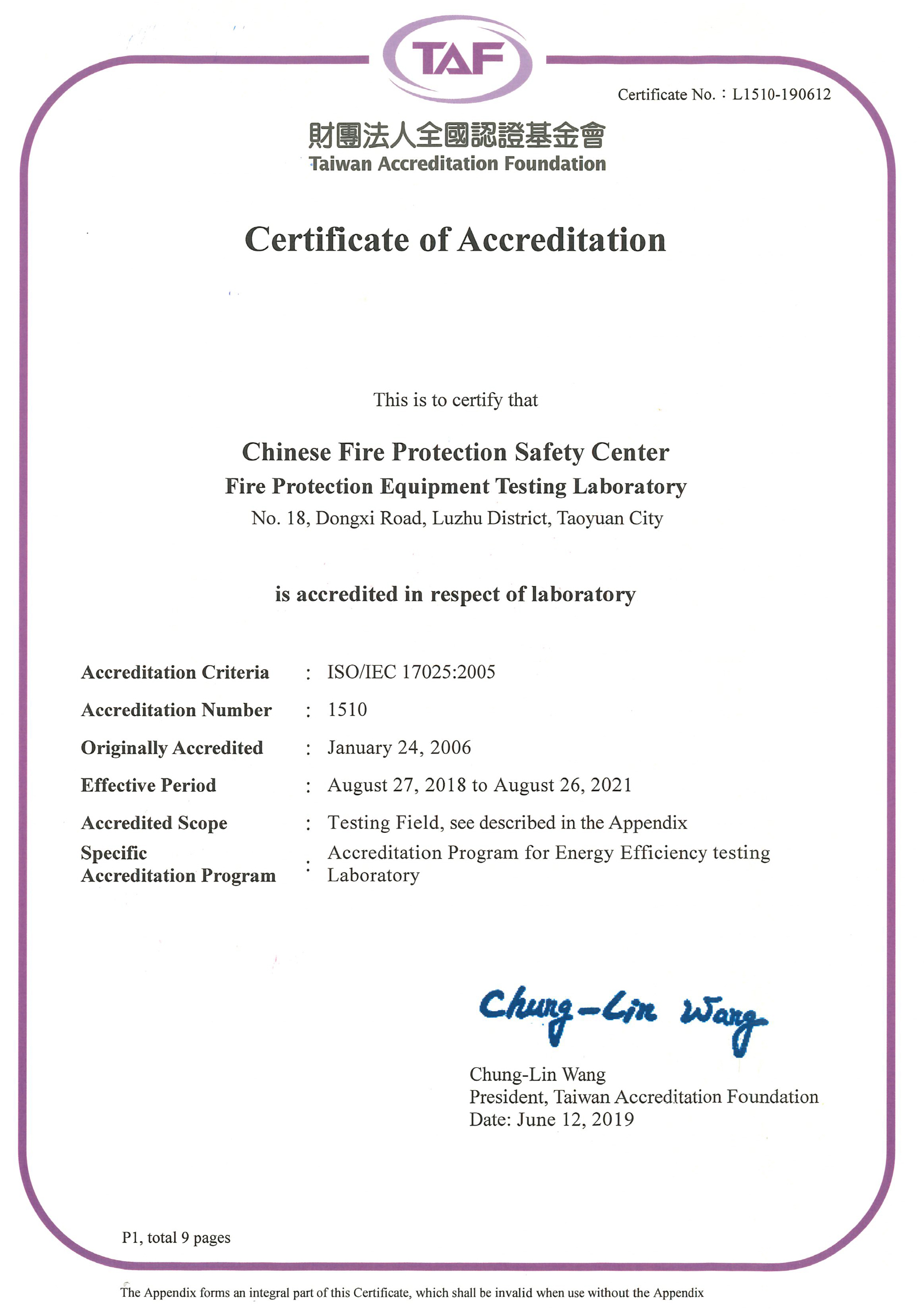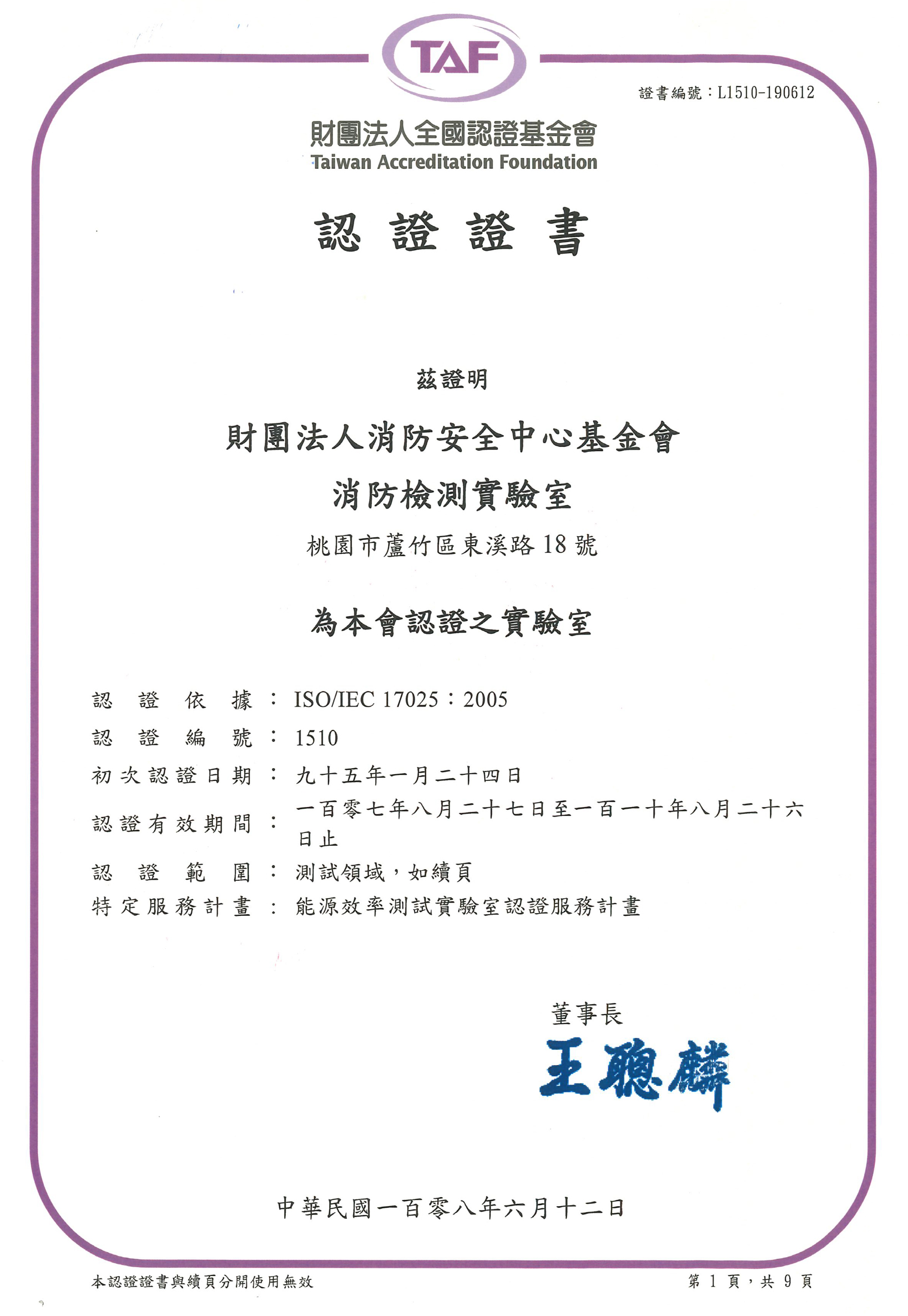 【TAF認證證書】,自107年8月27日至110年8月26日止。