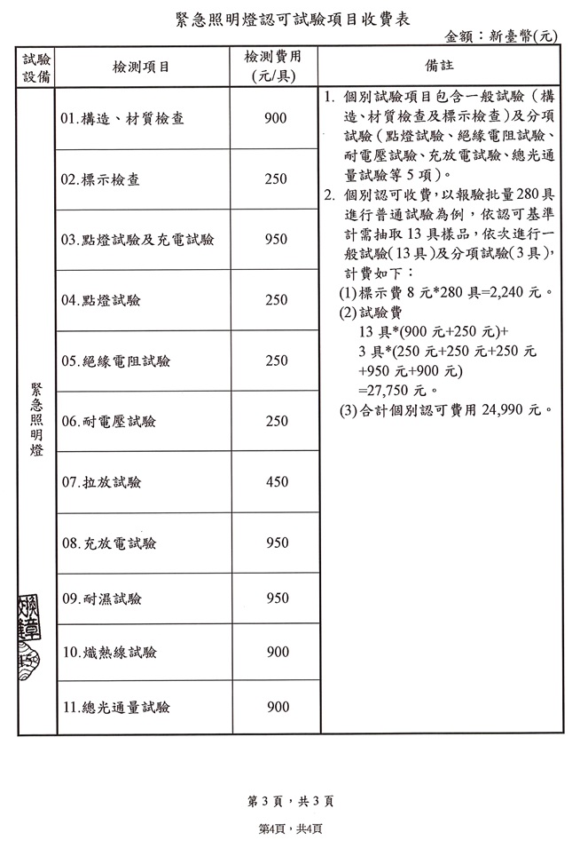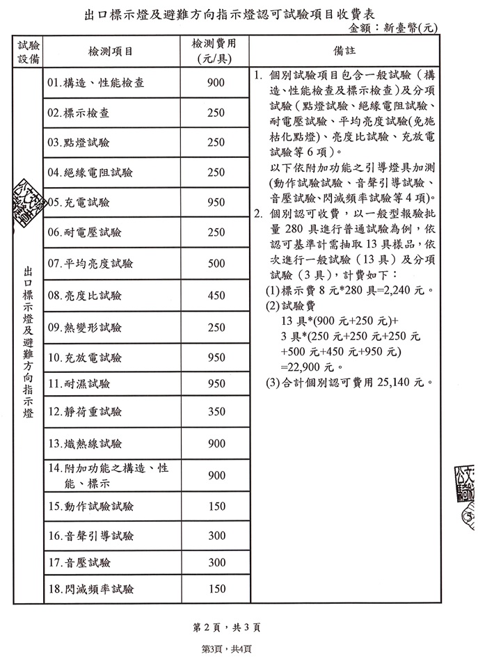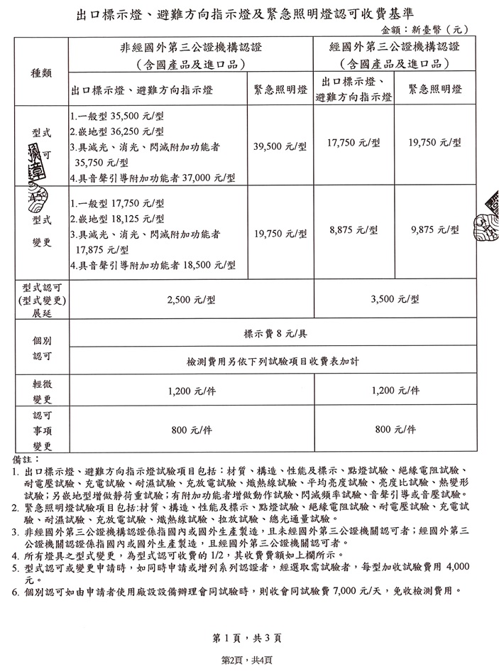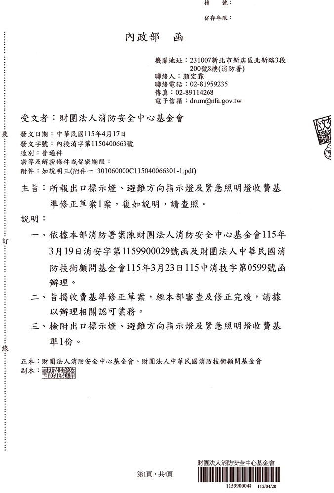 「出口標示燈、避難方向指示燈及緊急照明燈收費基準」修正規定,並自115年4月22日起施行 2026-04-22 出口標示燈、避難方向指示燈及緊急照明燈收費基準」修正規定,並自115年4月22日起施行。 說明: 一、依據內政部消防署115年4月17日內授消字第1150400663號函辦理。 二、隨文檢附修正後收費基準明細表1份,亦可至本中心網站(www.cfs.org.tw)下載。