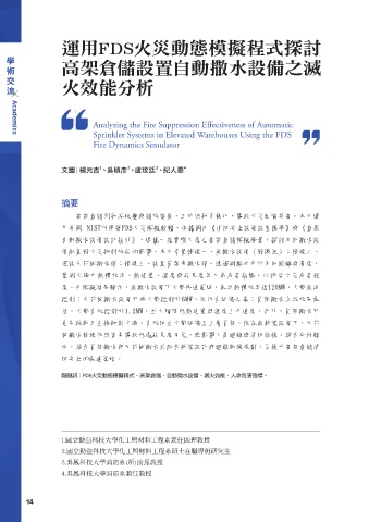 關鍵詞:FDS火災動態模擬程式、高架倉儲、自動撒水設備、滅火效能、人命危害指標。